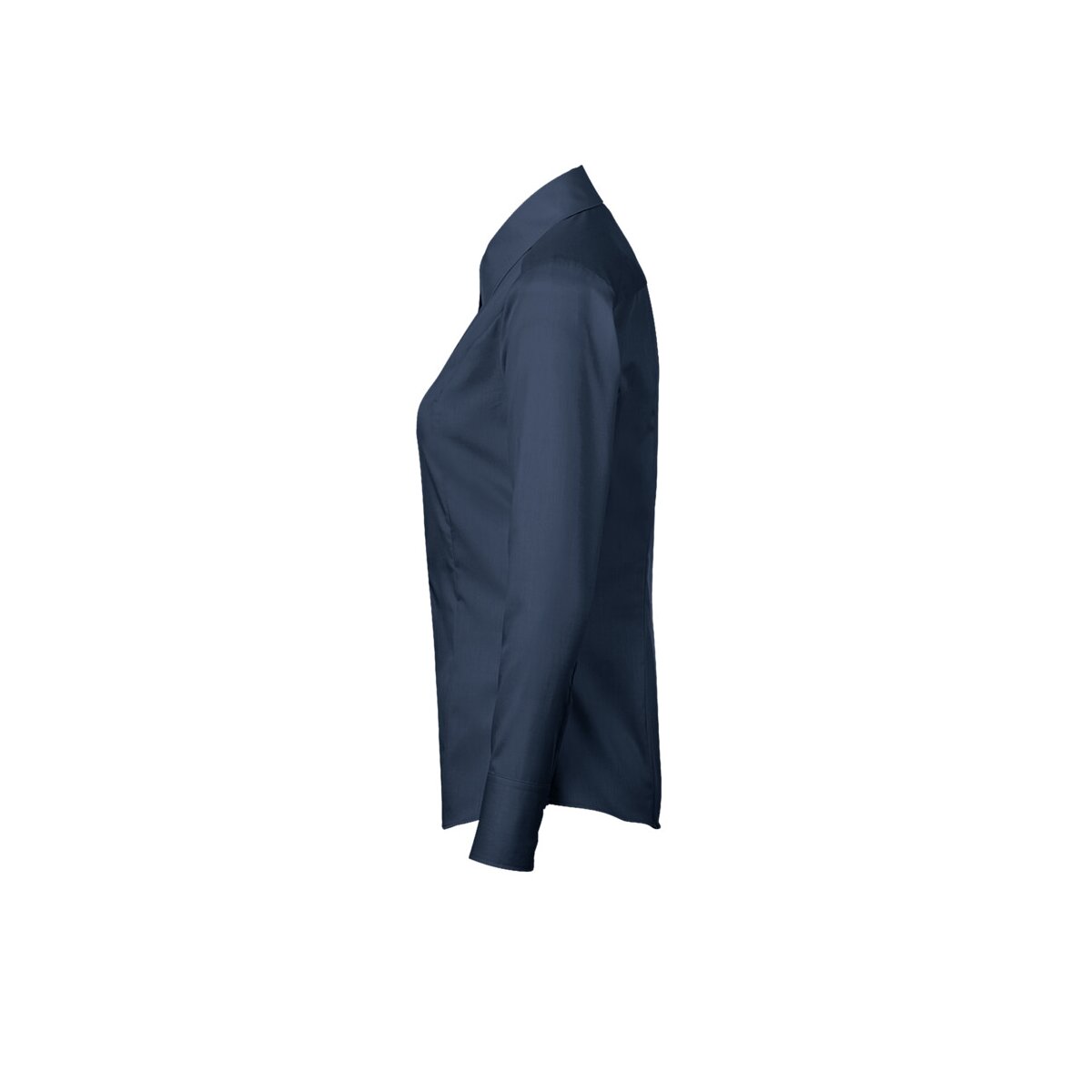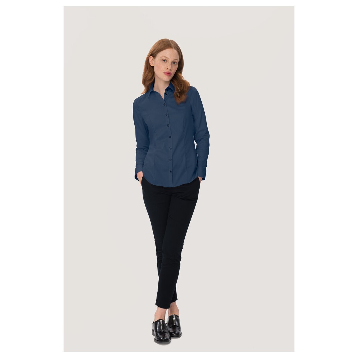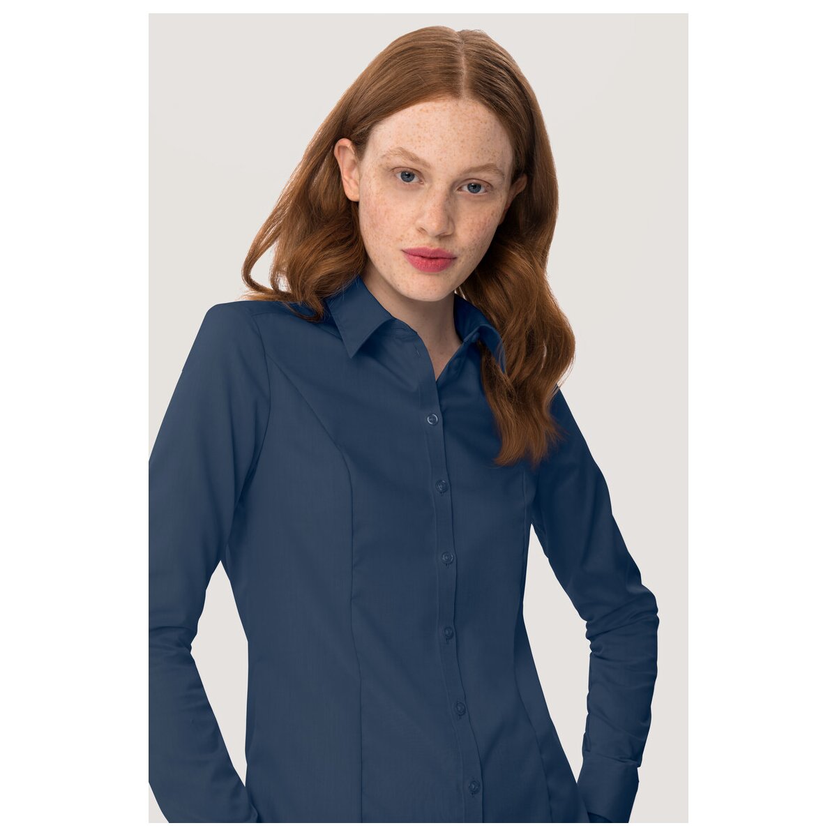 Der stilvolle Kent-Kragen sorgt für eine klare, klassische Optik und lässt sich hervorragend mit Blazer, Kostüm oder Businesshose kombinieren. Die leicht taillierte Passform entsteht durch formgebende Wiener Nähte im Vorderteil sowie Abnäher im Rückenteil und unterstreicht eine feminine Silhouette, ohne einzuengen. Ton-in-Ton-Knöpfe (bei Himmelblau in Weiß) und die edle dunkelblaue Satinpaspel an der inneren Kragennaht setzen dezente, hochwertige Akzente.