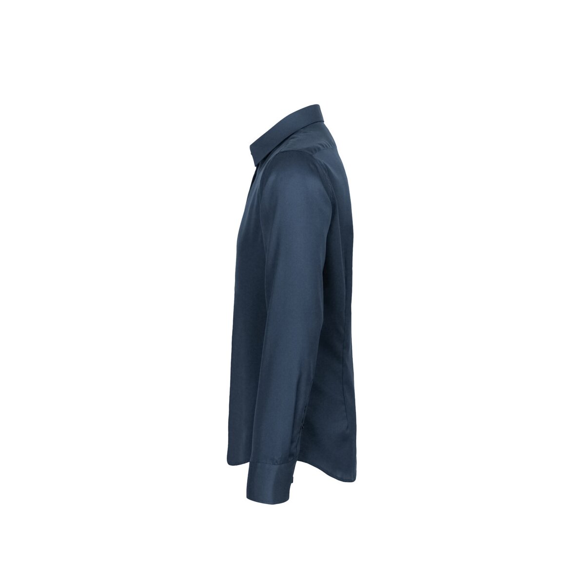 Die leicht taillierte Passform entsteht durch dezente Abnäher im Rückenteil und sorgt für eine moderne, gepflegte Silhouette, ohne die Bewegungsfreiheit einzuschränken. Ton-in-Ton-Knöpfe (bei Himmelblau in Weiß) sowie eine edle Paspel aus dunkelblauem Satin an der inneren Kragennaht setzen dezente, hochwertige Akzente. Eingearbeitete Kragenstäbchen, eine doppelte Schulterpasse und präzise Doppelkappnähte an den Seitennähten unterstreichen den professionellen Anspruch dieses Businesshemdes.