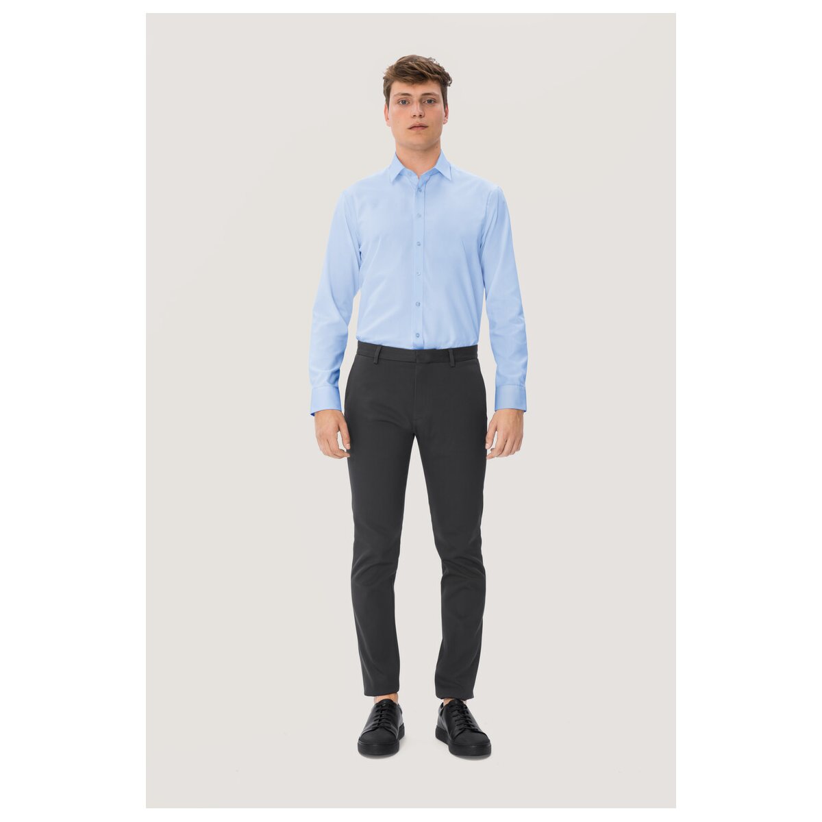 Das formstabile Baumwoll-Popeline-Gewebe ist strapazierfähig, angenehm leicht und dank seiner bügelfreien Eigenschaften besonders pflegeleicht – ideal für lange Arbeitstage und einen stets gepflegten Auftritt. Weitenverstellbare Manschetten und ein leicht gerundeter Saum sorgen für zusätzlichen Komfort und vielseitige Kombinationsmöglichkeiten, sowohl in der Hose als auch darüber getragen.